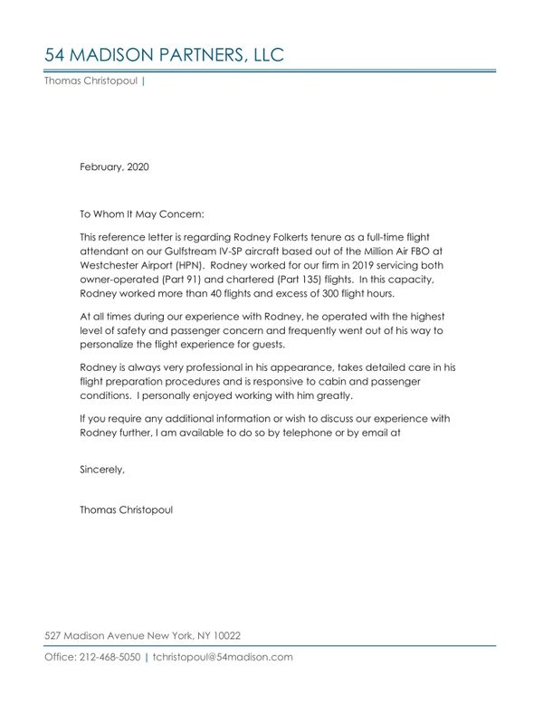 To whom it may concern, It's my pleasure to recommend Rodney Folkerts for a flight attendant position. Rodney worked with me at USA Networks as an corporate flight attendant on a Gulfstream GIV from early 2000 until late 2001. I was the chief pilot and aviation manager and was Rodney's immediate supervisor. We had recently moved the flight department to Teterboro, NJ from Van Nuys, CA and needed an east coast based person to fill the position of flight attendant. Rodney was recommended by our CEO’s office. I don't remember if Rodney had any flight attendant experience at the time, but he was a fast learner and adapted quickly. Rodney always had a positive outlook, and was a pleasure to be around on our many lay overs. I can confidently recommend Rodney Folkerts as a good team player with a professional attitude. Please feel free to contact me.